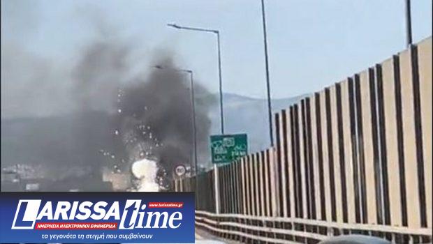 Στο βίντεο που ανάρτησε διερχόμενος οδηγός φαίνεται να έχει φτάσει ένα περιπολικό που έχει κλείσει τις δεξιές λωρίδες κυκλοφορίας ενώ δύο πυροσβέστες ρίχνουν νερό για να σβήσουν τη φωτιά.