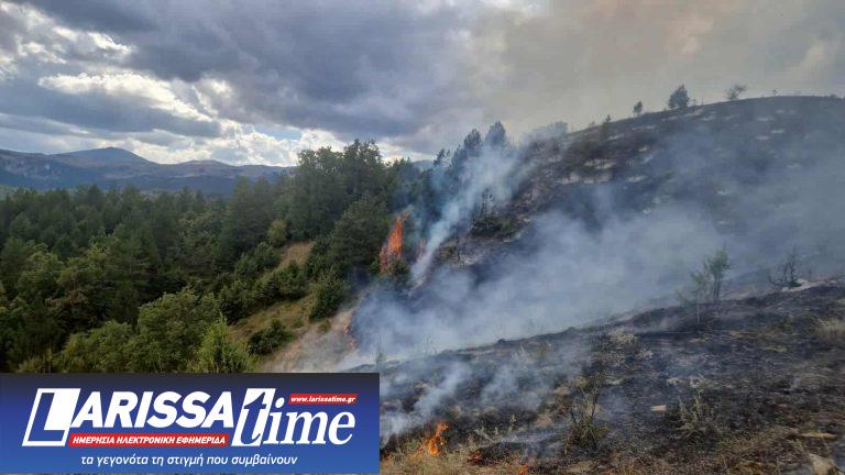 Σύμφωνα με πληροφορίες, η φωτιά καίει σε δύσβατο σημείο και δεν απειλεί κατοικημένες περιοχές.