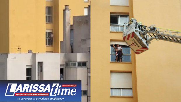 Ένας 23χρονος άνδρας, μη μπορώντας να διαφύγει μέσω των γεμάτων καπνό σκαλοπατιών, κατέφυγε στο περβάζι του παραθύρου κρατώντας στην αγκαλιά τον δίχρονο γιο του, περιμένοντας την άφιξη των πυροσβεστών.