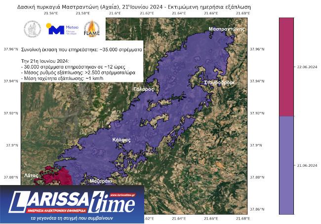 Στο παραπάνω χρονικό διάστημα (21.06.2024, ~15:00 με 23:59), ο εκτιμώμενος μέσος ρυθμός εξάπλωσης της πυρκαγιάς εκτιμάται μεγαλύτερος των 2.500 στρέμματα ανά ώρα.