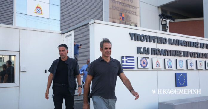 Ο πρωθυπουργός Κυριάκος Μητσοτάκης επέστρεψε στην Αθήνα την Κυριακή, όταν κατέστη σαφές ότι οι δυνάμεις πυρόσβεσης και διαχείρισης κρίσεων βρίσκονται αντιμέτωπες με την πιο δύσκολη πυρκαγιά του καλοκαιριού, με το επίκεντρο της καταστροφής να πλήττει για άλλη μια φορά την Αττική. Από τα ξημερώματα χθες ο κ. Μητσοτάκης βρισκόταν στο γραφείο του στο Μέγαρο Μαξίμου και νωρίς το πρωί επισκέφθηκε το κέντρο επιχειρήσεων του υπουργείου Κλιματικής Κρίσης και Πολιτικής Προστασίας για να ενημερωθεί για τις εξελίξεις στο μέτωπο των επιχειρήσεων, για την κατάσταση και τον επιχειρησιακό σχεδιασμό. Αμέσως μετά επέστρεψε στο Μαξίμου, όπου σε ανοιχτή γραμμή με τα συναρμόδια κυβερνητικά στελέχη ενημερωνόταν διαρκώς για τις εξελίξεις, ενώ αργά το απόγευμα βρέθηκε και πάλι στο κέντρο επιχειρήσεων.