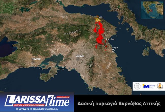 Η εξάπλωση των θερμών σημείων από την περιοχή του Βαρνάβα αποκαλύπτει την μεγάλη επέκταση της δασικής πυρκαγιάς, η οποία καθοδηγείται κυρίως από τους βόρειους/βορειοανατολικούς ανέμους, ενώ η μεγάλη ξηρότητας της βλάστησης επιταχύνει τη διάδοση της φωτιάς, ενισχύει το θερμικό της φορτίο και συνεισφέρει στην εκδήλωση πυκνών κηλιδώσεων (παραγωγή καυτρών, μεταφορά τους από τον άνεμο, εναπόθεση σε άκαυτη βλάστηση και έναρξη νέων εστιών).