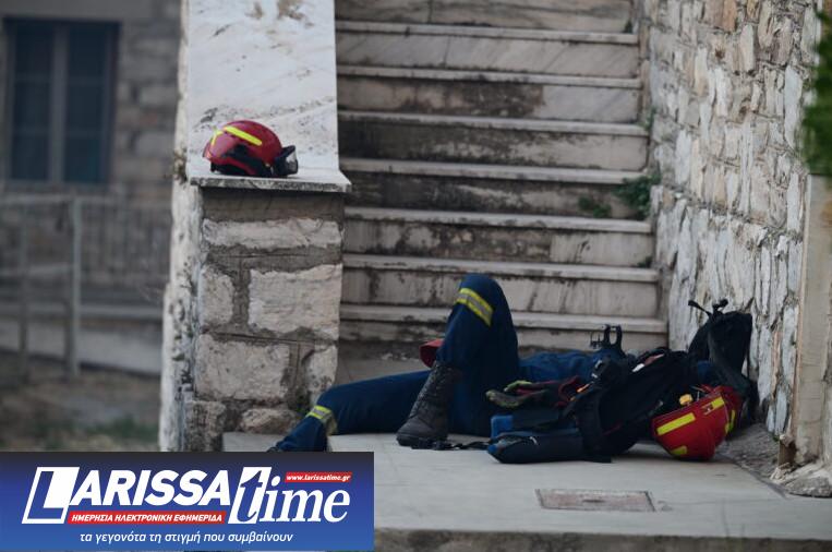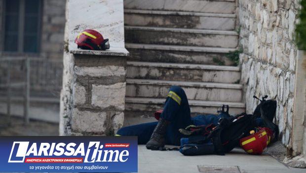 Με το πρώτο φως της ημέρας άρχισαν να επιχειρούν τα εναέρια μέσα, δίνοντας τη δυνατότητα στους άνδρες της Πυροσβεστικής να πάρουν μια ανάσα, όπως ο συγκεκριμένος στη φωτογραφία που ακόμα φοράει τη μάσκα του.