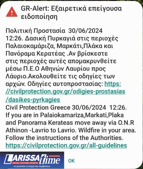Νωρίτερα εστάλησαν μηνύματα του «112» σε κατοίκους έξι οικισμών για να εγκαταλείψουν τα σπίτια τους στις εξής περιοχές: Άγιος Κωνσταντίνος Λαυρίου, Άγιος Γεώργιος Θωρικού, Μαρκάτι, Παλαιοκαμάριζα, Πλάκα και Πανόραμα στην Κερατέα.