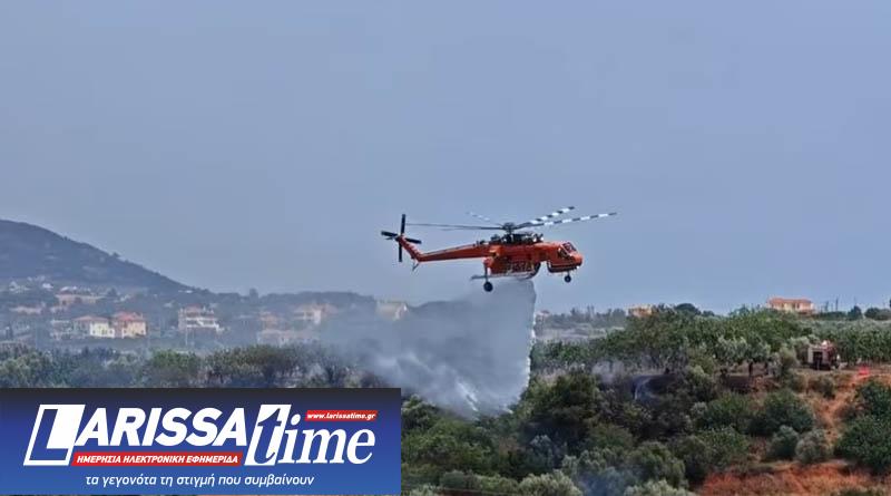 Στο σημείο έσπευσαν και επιχείρησαν 12 πυροσβέστες με 5 οχήματα και εθελοντές, ενώ από αέρος πραγματοποίησε ρίψεις νερού ένα ελικόπτερο.