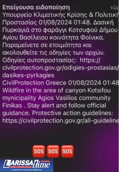 Οι Αρχές στο μήνυμά τους αναφέρουν ότι η φωτιά καίει στο φαράγγι Κοτσυφού του δήμου Αγίου Βασιλείου, στην κοινότητα Φοίνικα, και ζητούν από τους κατοίκους της περιοχής να είναι σε ετοιμότητα, σε περίπτωση που χρειαστεί η εκκένωση κάποιου οικισμού.