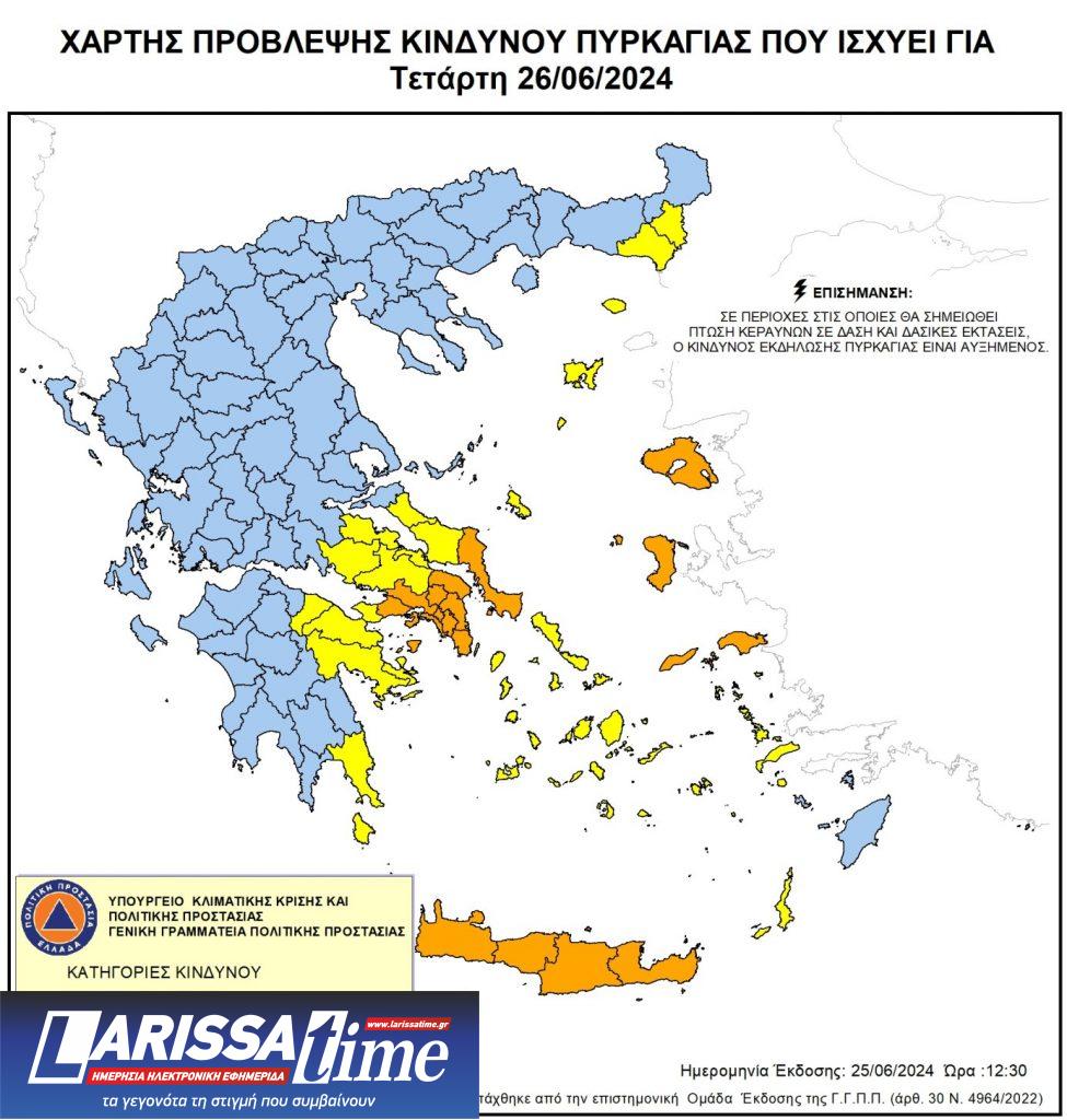 Η Πολιτική Προστασία Περιφέρειας Κρήτης ενημερώνει ότι, σύμφωνα με τον ημερήσιο Χάρτη Πρόβλεψης Κινδύνου Πυρκαγιάς της Γενικής Γραμματείας Πολιτικής Προστασίας την Τετάρτη 26 Ιουνίου η κατηγορία Κινδύνου Πυρκαγιάς για όλη την Κρήτη, είναι κατηγορίας κινδύνου 4 (πολύ υψηλός).