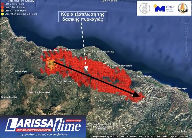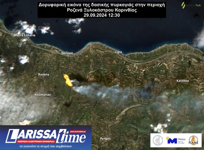Υπό αυτές τις συνθήκες η δασική πυρκαγιά εξαπλώθηκε γρήγορα ανατολικά-νοτιοανατολικά προς την περιοχή του Ξυλόκαστρου όπως φαίνεται στην Εικόνα 2 όπου παρουσιάζονται τα θερμά σημεία που εντοπίσαν οι δορυφόροι πολικής τροχιάς έως τις πρωινές ώρες της Δευτέρας 30.09.2024.
