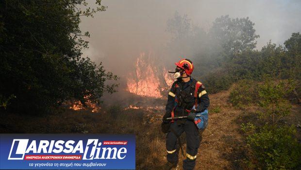 Σύμφωνα με την Πυροσβεστική, η φωτιά καίει χαμηλή βλάστηση, ενώ επιχειρούν επίγειες και εναέριες δυνάμεις.