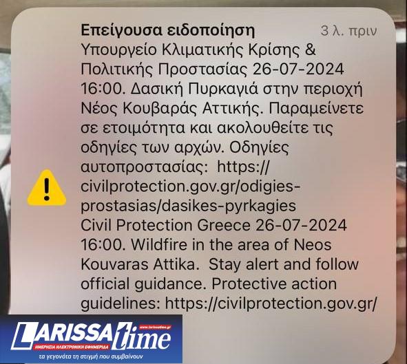 Στις 16:00 στάλθηκε μήνυμα από το 112 στους κατοίκους του Κουβαρά, να βρίσκονται σε ετοιμότητα.