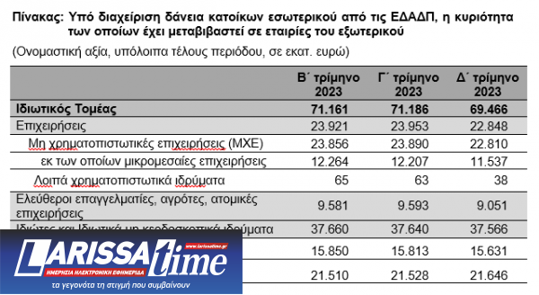 Η ονομαστική αξία των υπό διαχείριση δανείων προς ιδιώτες και ιδιωτικά μη κερδοσκοπικά ιδρύματα μειώθηκε κατά 74 εκατ. ευρώ έναντι του προηγούμενου τριμήνου και διαμορφώθηκε σε 37.566 εκατ. ευρώ στο τέλος του δ΄ τριμήνου του 2023. Αναλυτικότερα, τα υπό διαχείριση καταναλωτικά δάνεια παρουσίασαν μείωση κατά 182 εκατ. ευρώ και διαμορφώθηκαν σε 15.631 εκατ. ευρώ. Τα υπό διαχείριση στεγαστικά δάνεια παρουσίασαν αύξηση κατά 117 εκατ. ευρώ και διαμορφώθηκαν σε 21.646 εκατ. ευρώ.