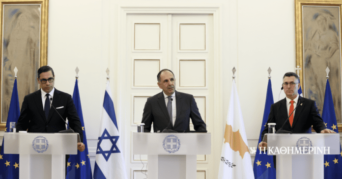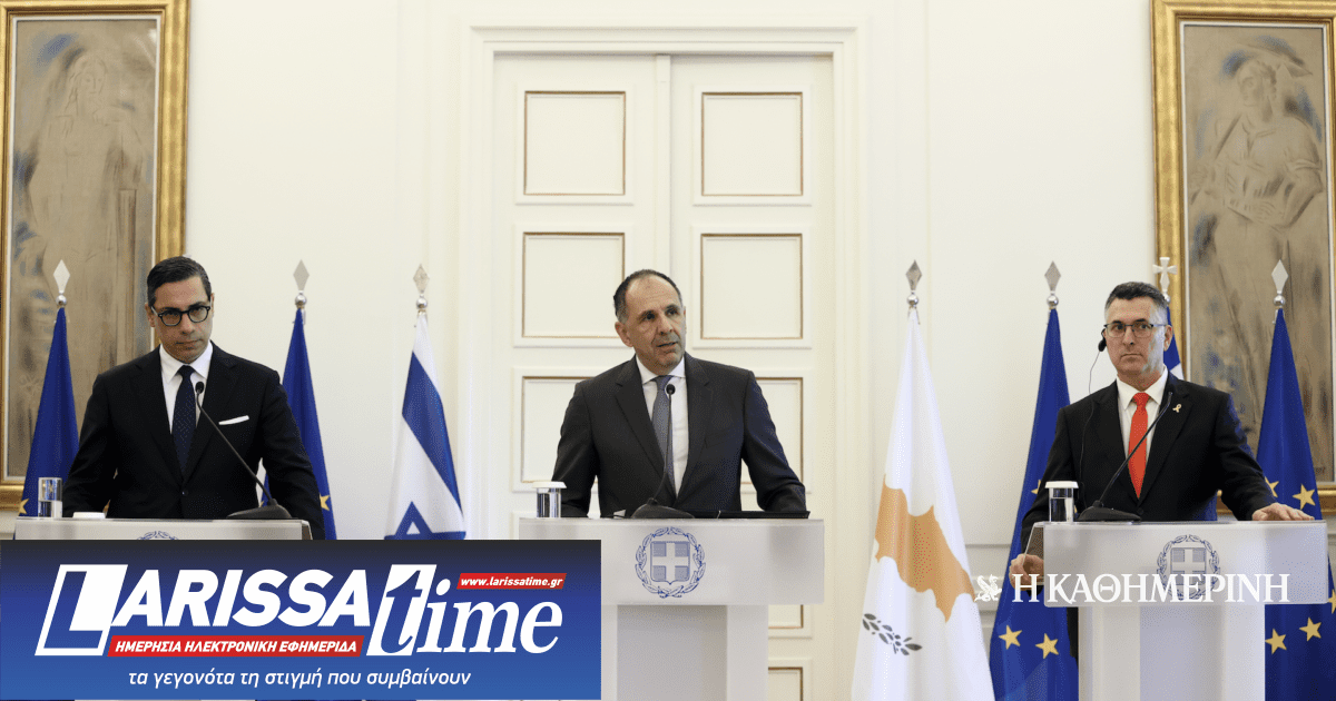 «Η προώθηση της περιφερειακής συνεργασίας μέσω της διασυνδεσιμότητας καθιστά την περιοχή μας πιο ασφαλή και ανθεκτική σε ένα περιβάλλον γενικότερης αστάθειας», ανέφερε ο υπουργός Εξωτερικών Γιώργος Γεραπετρίτης, μετά την ολοκλήρωση της τριμερούς συνάντησης Ελλάδας, Κύπρου και Ισραήλ στην Αθήνα, στην οποία συμμετείχαν ο υπουργός Εξωτερικών της Κυπριακής Δημοκρατίας, Κωνσταντίνος Κόμπος, και ο υπουργός Εξωτερικών του Ισραήλ, Γκίντεον Σαάρ.