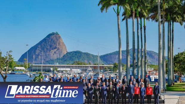 Οι χώρες μέλη της G20 τάσσονται υπέρ «κάθε εποικοδομητικής πρωτοβουλίας» με σκοπό να υπάρξει «δίκαιη και διαρκής ειρήνη» στην Ουκρανία, με κοινή ανακοίνωσή τους που έδωσαν στη δημοσιότητα κατά τη σύνοδο των ηγετών τους στο Ρίο ντε Ζανέιρο («οικογενειακή» φωτογραφία της G20, επάνω, από το Χ, @LulaOficial).