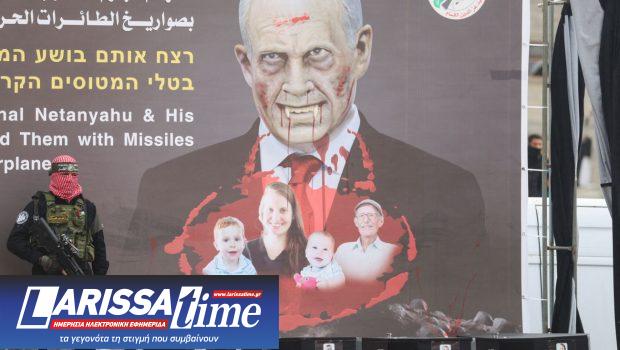 Η φωτογραφία στην εξέδρα που έστησε η Χαμάς – Ο Νετανιάχου και οι σοροί των τεσσάρων ομήρων