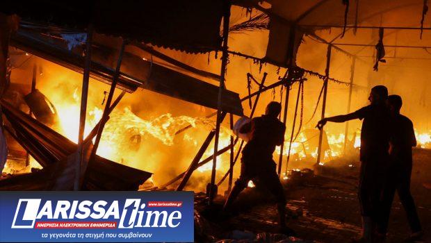 Μετά την επίθεση ξέσπασε φωτιά που εξαπλώθηκε ταχύτατα στις σκηνές των εκτοπισμένων.