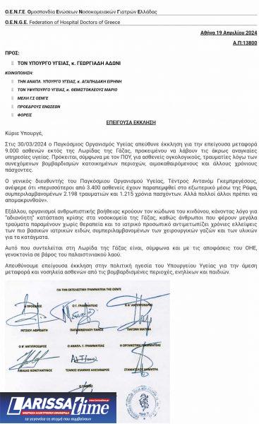 Η ΟΕΝΓΕ ανταποκρινόμενη στο αίτημα του επικεφαλής του Παγκόσμιου Οργανισμού Υγείας, Τέντρος Αντανόμ Γκεμπρεγέσους καλεί τον υπουργό Υγείας Άδωνη Γεωργιάδη και την ηγεσία του υπουργείου, να υποδεχθεί ασθενείς από τη Γάζα.