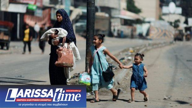 «Οι συνάδελφοί μας από την Υπηρεσία Αρωγής και Εργων του ΟΗΕ – UNRWA – είπαν ότι μέχρι χθες Τετάρτη, περίπου 600.000 άνθρωποι – το ένα τέταρτο του πληθυσμού της Γάζας – έχουν εκτοπιστεί από τη Ράφα από τις 6 Μαΐου, καθώς η ισραηλινή χερσαία επιχείρηση συνεχίζεται», ανέφερε ο αναπληρωτής Εκπρόσωπος Τύπου του ΓΓ του ΟΗΕ, Φαρχάν Χακ, κατά τη διάρκεια της ενημέρωσης Τύπου στην έδρα του διεθνούς οργανισμού στη Νέα Υόρκη (στη φωτογραφία του Reuters/Mohammed Salem, επάνω, Παλαιστίνιοι εγκαταλείπουν τη Ράφα).