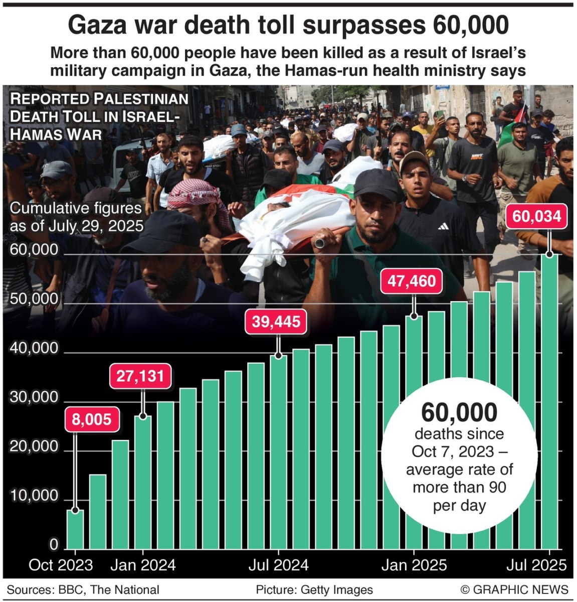 Ο επίσημος αριθμός των νεκρών Παλαιστίνιων από τον πόλεμο του Ισραήλ στη Γάζα έχει ξεπεράσει τις 60.000.