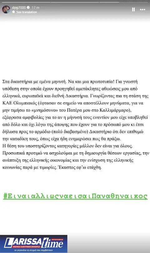 Νωρίτερα ο Δημήτρης Γιαννακόπουλος με story του στο instagram ενημέρωνε δημόσια και εγγράφως πως δεν επιθυμεί την καταδίκη των Παναγιώτη και Γιώργου Αγγελόπουλων.