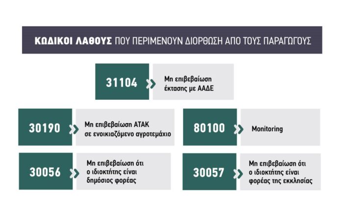 - ΑΤΑΚ: Θα πρέπει να υπάρξει κατακερµατισµός ειδικά στους κωδικούς 31104 (Μη επιβεβαίωση έκτασης µε ΑΑ∆Ε) και 30190 (Μη επιβεβαίωση ΑΤΑΚ σε ενοικιαζόµενο αγροτεµάχιο σε περισσότερους κωδικούς). Υπάρχουν περιπτώσεις στις οποίες στο Ε9 των παραγωγών η έκταση καλύπτει το δηλωθέν αγροτεµάχιο χωρίς καµία υπέρβαση, αλλά τα αγροτεµάχια µηδενίζονται µε τον κωδικό 31104. Ωστόσο, ήδη ανακοινώθηκε µια λύση σχετικά µε αγροτεµάχια µικρότερα των 20 στρεµµάτων (ρεπορτάζ σελ. 11)