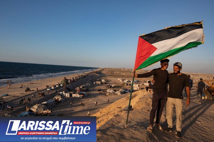 Παλαιστίνιοι τοποθετούν τη σημαία της Παλαιστίνης στον γυρισμό προς τη Γάζα