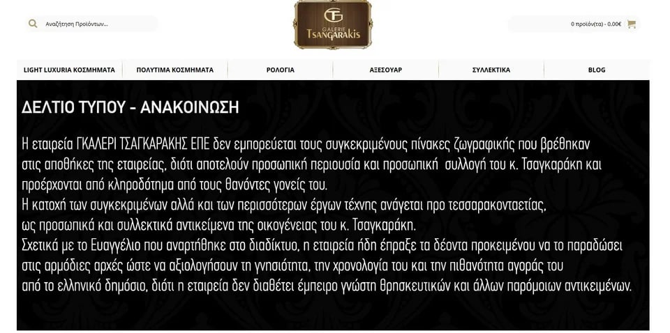 «Η εταιρεία ΓΚΑΛΕΡΙ ΤΣΑΓΚΑΡΑΚΗΣ ΕΠΕ δεν εμπορεύεται τους συγκεκριμένους πίνακες ζωγραφικής που βρέθηκαν στις αποθήκες της εταιρείας, διότι αποτελούν προσωπική περιουσία και προσωπική συλλογή του κ. Τσαγκαράκη και προέρχονται από κληροδότημα από τους θανόντες γονείς του. Η κατοχή των συγκεκριμένων αλλά και των περισσότερων έργων τέχνης ανάγεται προ τεσσαρακονταετίας, ως προσωπικά και συλλεκτικά αντικείμενα της οικογένειας του κ. Τσαγκαράκη. Σχετικά με το Ευαγγέλιο που αναρτήθηκε στο διαδίκτυο, η εταιρεία ήδη έπραξε τα δέοντα προκειμένου να το παραδώσει στις αρμόδιες αρχές ώστε να αξιολογήσουν τη γνησιότητα, την χρονολογία του και την πιθανότητα αγοράς του από το ελληνικό δημόσιο, διότι η εταιρεία δεν διαθέτει έμπειρο γνώστη θρησκευτικών και άλλων παρόμοιων αντικειμένων».