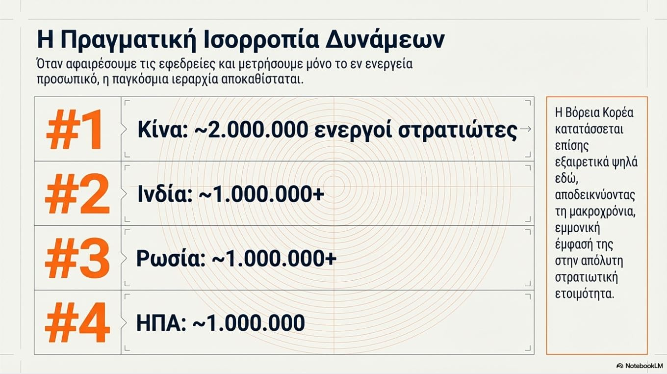 Όταν συμπεριλαμβάνουμε τους εφέδρους και τις παραστρατιωτικές δυνάμεις, η εικόνα αλλάζει δραματικά. Η κατάταξη δεν καθορίζεται πλέον από την τεχνολογία ή τον προϋπολογισμό, αλλά από τους ανθρώπους που μπορεί να κινητοποιήσει μια χώρα σε κατάσταση πλήρους πολέμου.