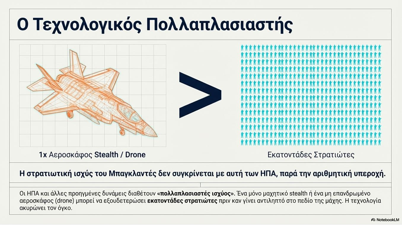 Είναι κρίσιμο να θυμόμαστε ότι η στρατιωτική ισχύς του Μπανγκλαντές δεν είναι ίδια με των ΗΠΑ. Οι ΗΠΑ διαθέτουν πολλαπλασιαστή ισχύος χάρη στην τεχνολογία που διαθέτουν: ένα μόνο μαχητικό stealth ή ένα drone μπορεί να εξουδετερώσει εκατοντάδες στρατιώτες πριν καν γίνει αντιληπτό.