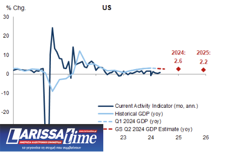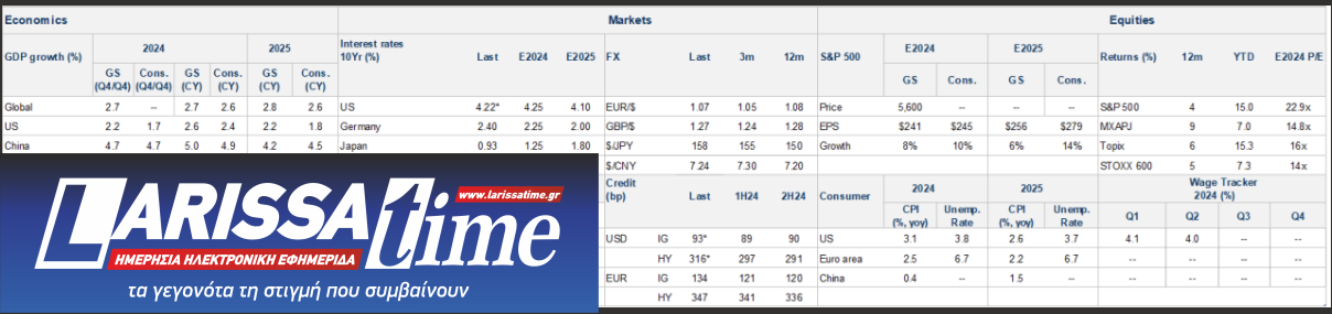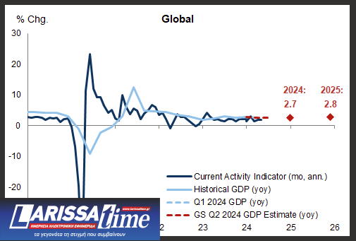 Σε παγκόσμιο επίπεδο, η Goldman Sachs αναμένει αύξηση του πραγματικού ΑΕΠ της τάξης του 2,7% σε ετήσια βάση το 2024, αντανακλώντας την υποστήριξη από την αύξηση του πραγματικού εισοδήματος των νοικοκυριών, τη σταδιακή ανάκαμψη της μεταποιητικής δραστηριότητας και τη διεύρυνση των μειώσεων των επιτοκίων.