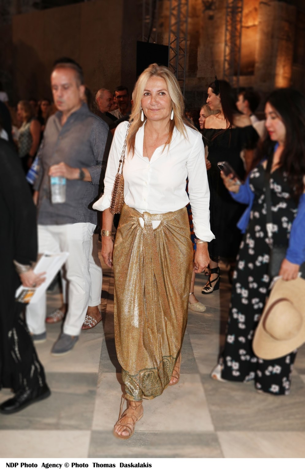 Η φούστα συνδυάστηκε άψογα με ένα κομψό λευκό πουκάμισο και λευκά σκουλαρίκια, προσθέτοντας φινέτσα και ισορροπία στο σύνολο. Η εμφάνιση ολοκληρώθηκε με δερμάτινα σανδάλια, που πρόσθεσαν άνεση και στυλ, ενώ κρατούσε μια λαμπερή τσάντα με μεταλλικές λεπτομέρειες, προσθέτοντας μια πινελιά πολυτέλειας και λάμψης.