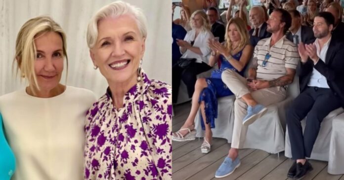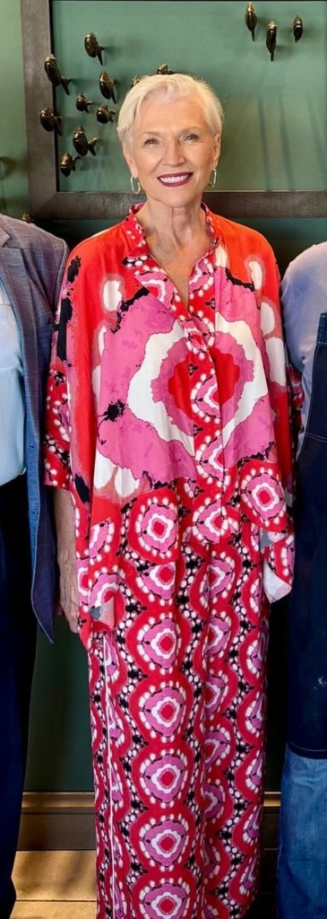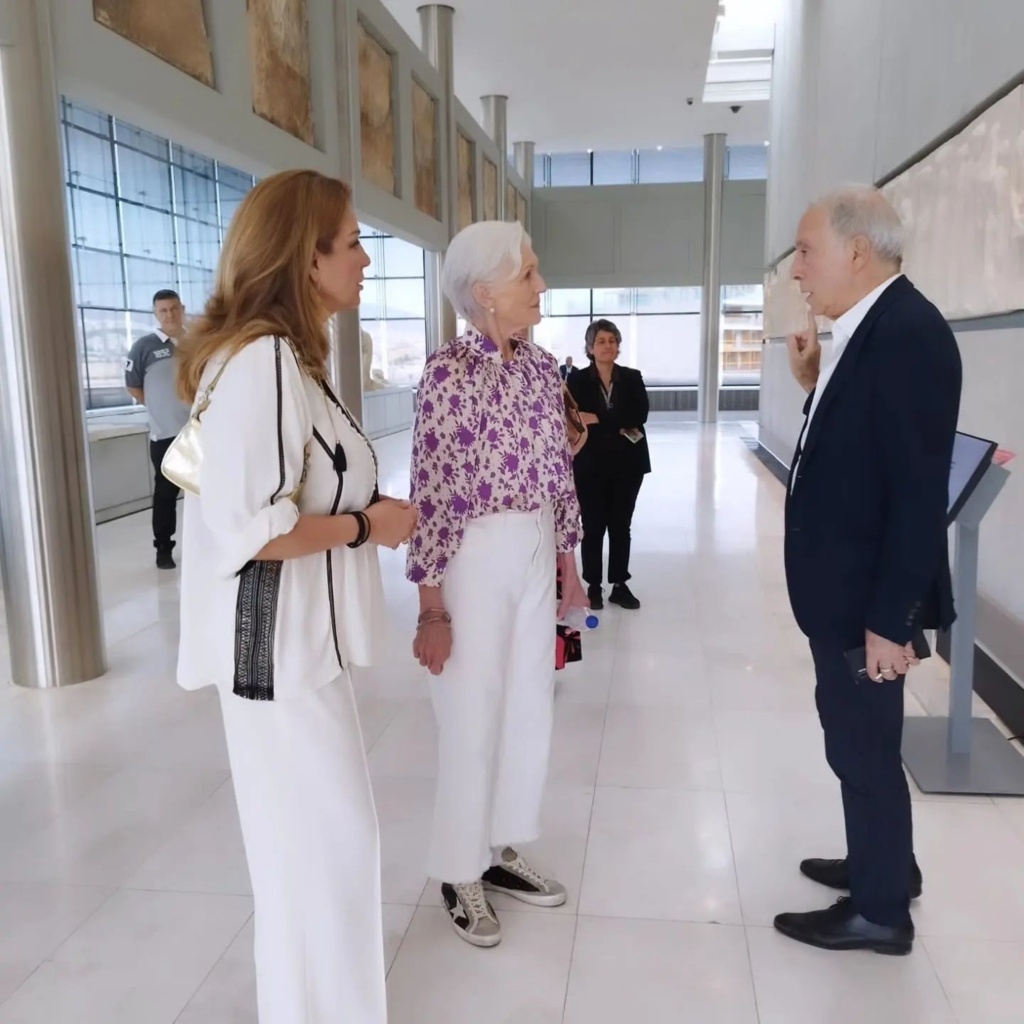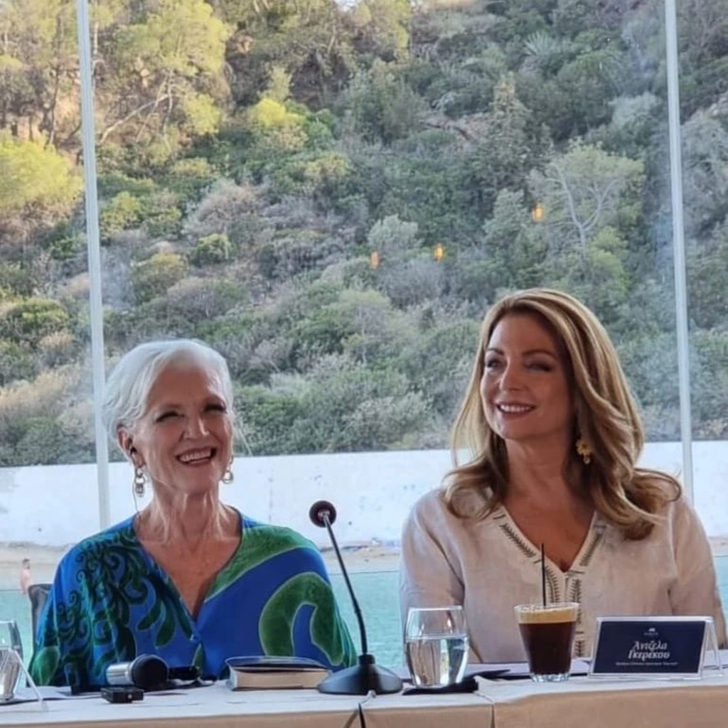 Μεταξύ άλλων η Μάγιε Μασκ συναντήθηκε με τη Μαρέβα Γκραμπόφσκι Μητσοτάκη, με την οποία πόζαρε. H 76χρονη φόρεσε ένα εμπριμέ τοπ με λευκό παντελόνι, ενώ η Μητσοτάκη φόρεσε κρεμ τοπ με λαιμόκοψη και μαύρο παντελόνι.