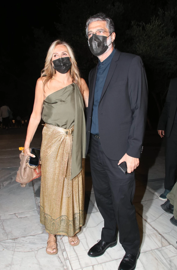 Για την περίσταση, η Μαρέβα επέλεξε μια εντυπωσιακή φούστα – παρεό σε χρυσή απόχρωση, διακοσμημένη με λαδί αρχαιοελληνικό μοτίβο στο κάτω μέρος. Αυτή η επιλογή της πρόσθεσε μια αίσθηση κλασικής κομψότητας και μοντέρνας αισθητικής.