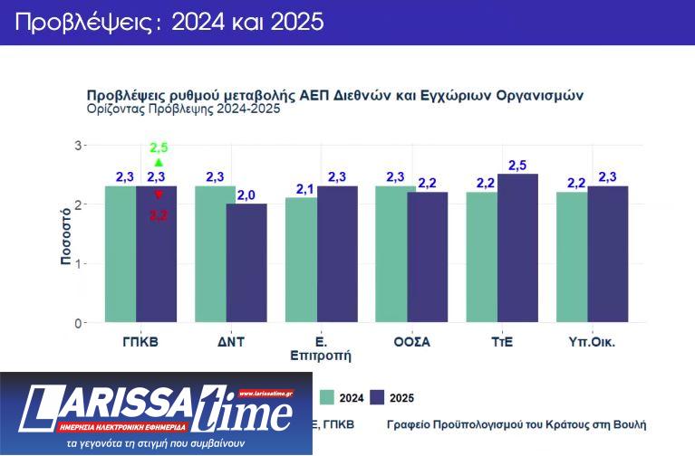 – Τα μακροοικονομικά και δημοσιονομικά μεγέθη του Σχεδίου Προϋπολογισμού 2025, που εγκρίθηκε κατά πλειοψηφία στη Βουλή, βρίσκονται σε πλήρη εναρμόνιση με τις εκτιμήσεις του δεσμευτικού Μεσοπρόθεσμου Δημοσιονομικού – Διαρθρωτικού Σχεδίου 2025-2028 (ΜΔΣ) το οποίο έλαβε και την έγκριση της Ευρωπαϊκής Επιτροπής. Το μακροοικονομικό σενάριο προβλέπει μεγέθυνση του ΑΕΠ 2,2% για το 2024 και 2,3% για το 2025, ενώ ο πληθωρισμός (εναρμονισμένος δείκτης τιμών καταναλωτή) αναμένεται να διαμορφωθεί σε 2,8% το 2024 και 2,1% το 2025. Οι εκτιμήσεις και παραδοχές της Έκθεσης του Προϋπολογισμού βάσει των οποίων διαμορφώνεται τόσο η εκτίμηση για ανάπτυξη 2,3% για το 2025 όσο και ο στόχος του πρωτογενούς πλεονάσματος για 2,4% του ΑΕΠ για το ίδιο έτος είναι ρεαλιστικές. Η εκτίμηση του Γραφείου για τον ρυθμό μεγέθυνσης της Ελληνικής οικονομίας για το 2025 εμπεριέχεται σε ένα εύρος πρόβλεψης που διαμορφώνεται μεταξύ 2,2% και 2,5%. Θετικές προοπτικές αλλά και κίνδυνοι ενδέχεται να επηρεάσουν τον ρυθμό μεγέθυνσης της οικονομίας συμπαρασύροντας και το δημοσιονομικό αποτέλεσμα για το 2025.