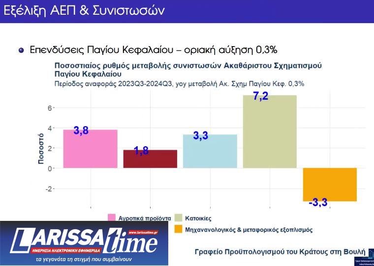 – Το Ακαθάριστο Εγχώριο Προϊόν (ΑΕΠ) παρουσίασε αύξηση 2,4% το τρίτο τρίμηνο του 2024 σε σχέση με το τρίτο τρίμηνο του 2023 (προσωρινά στοιχεία της ΕΛΣΤΑΤ), ενώ το αντίστοιχο μέγεθος στην Ευρωζώνη είναι 0,9%. Σε αυτή την επίδοση συνετέλεσαν η αύξηση της ιδιωτικής κατανάλωσης (2,1%) που εξακολουθεί να παρουσιάζει ανθεκτικότητα και η αύξηση των εξαγωγών αγαθών και υπηρεσιών (3,3% συνολικά, 5,1% για υπηρεσίες και 1,2% για αγαθά). Είναι αξιοσημείωτη η αύξηση των καταθέσεων των νοικοκυριών και επιχειρήσεων με βάση τα στοιχεία της Τράπεζας της Ελλάδος, οι οποίες αυξήθηκαν από 132.9 εκατ. ευρώ τον Ιανουάριο του 2019 (αρχή της περιόδου για την οποία υπάρχουν διαθέσιμα στοιχεία) σε 195.5 εκατ. ευρώ τον Οκτώβριο 2024 (τελευταίος μήνας διαθεσιμότητας στοιχείων), μία αύξηση 47,1%. Οι επενδύσεις παγίου κεφαλαίου αυξήθηκαν κατά 0,3%. Αρνητική ήταν η συμβολή της δημόσιας κατανάλωσης (-1,4%) και των εισαγωγών αγαθών και υπηρεσιών (αύξηση 4,2% συνολικά).