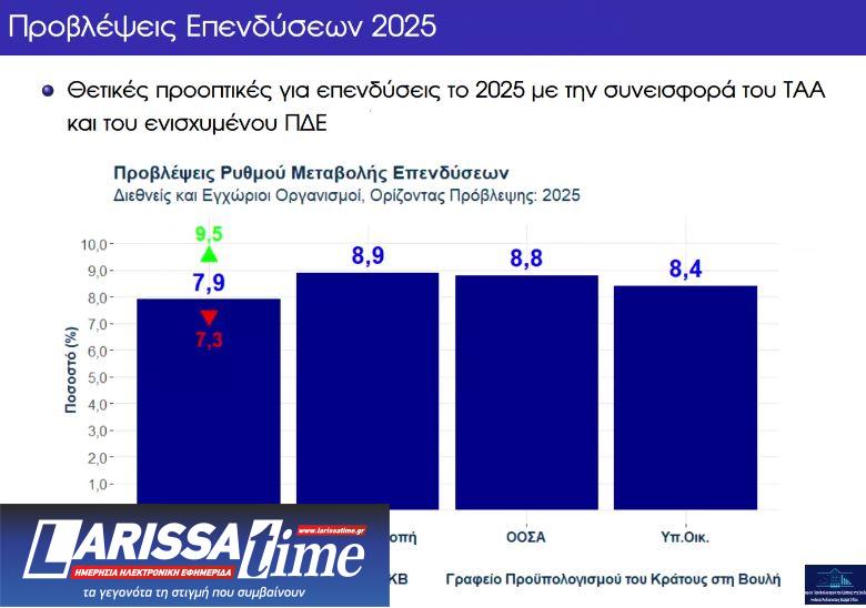 Για τις επενδύσεις το Γραφείο Προϋπολογισμού της Βουλής εκτιμά ότι το 2025 θα αυξηθούν στα επίπεδα του 8% με τη συμβολή του Ταμείου Ανάκαμψης ενώ δίνει ιδιαίτερη σημασία στη μείωση των φορολογικών και ασφαλιστικών βαρών στην εργασία.