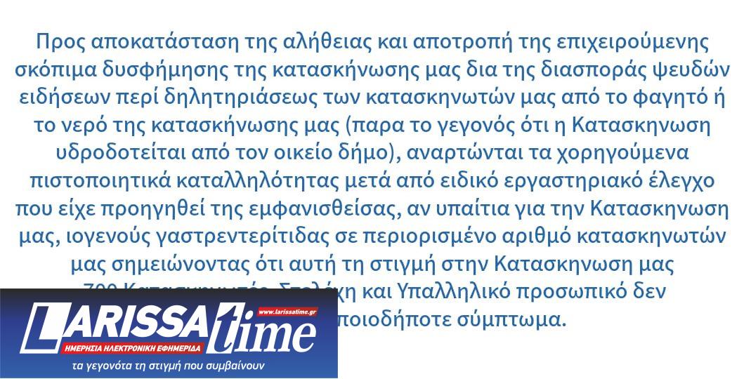 «Προς αποκατάσταση της αλήθειας και αποτροπή της επιχειρούμενης σκόπιμα δυσφήμησης της κατασκήνωσης μας δια της διασποράς ψευδών ειδήσεων περί δηλητηριάσεως των κατασκηνωτών μας από το φαγητό ή το νερό της κατασκήνωσης μας (παρα το γεγονός ότι η Κατασκηνωση υδροδοτείται από τον οικείο δήμο), αναρτώνται τα χορηγούμενα πιστοποιητικά καταλληλότητας μετά από ειδικό εργαστηριακό έλεγχο που είχε προηγηθεί της εμφανισθείσας, αν υπαίτια για την Κατασκήνωση μας, ιογενούς γαστρεντερίτιδας σε περιορισμένο αριθμό κατασκηνωτών μας σημειώνοντας ότι αυτή τη στιγμή στην Κατασκήνωση μας 700 Κατασκηνωτές, Στελέχη και Υπαλληλικό προσωπικό δεν παρουσιάζουν οποιοδήποτε σύμπτωμα», αναφέρει η ανακοίνωση.