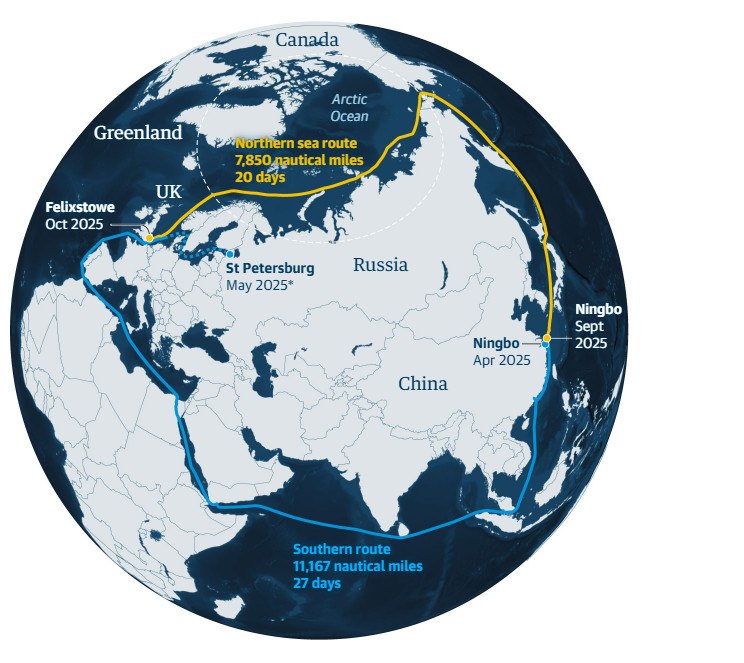 Σύμφωνα με την ανάλυση του Guardian, τα παραπάνω αναδιαμορφώνουν τον παγκόσμιο εμπορικό χάρτη, προσθέτοντας διαδρομές που θα μπορούσαν να αποτελέσουν εναλλακτικές λύσεις για τη διώρυγα του Σουέζ και να μειώσουν το ταξίδι από τη Δυτική Ευρώπη στην Ανατολική Ασία σχεδόν στο μισό.