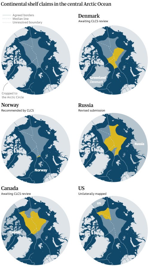 Αρκετές χώρες έχουν αξιώσεις για την Αρκτική: ο Καναδάς, η Δανία, η Νορβηγία, η Ρωσία και οι ΗΠΑ.