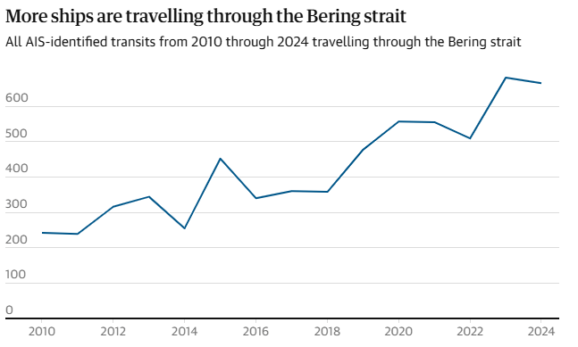 Σύμφωνα με στοιχεία του Marine Exchange of Alaska, ενός οργανισμού παρακολούθησης της ναυτιλίας, το 2024 πραγματοποιήθηκαν 665 μεταφορές μέσω του περάσματος του Μπέρινγκ, που χωρίζει τη Ρωσία από τις ΗΠΑ, μια αύξηση της τάξης του 175% σε σχέση με τις 242 μεταφορές του 2010.