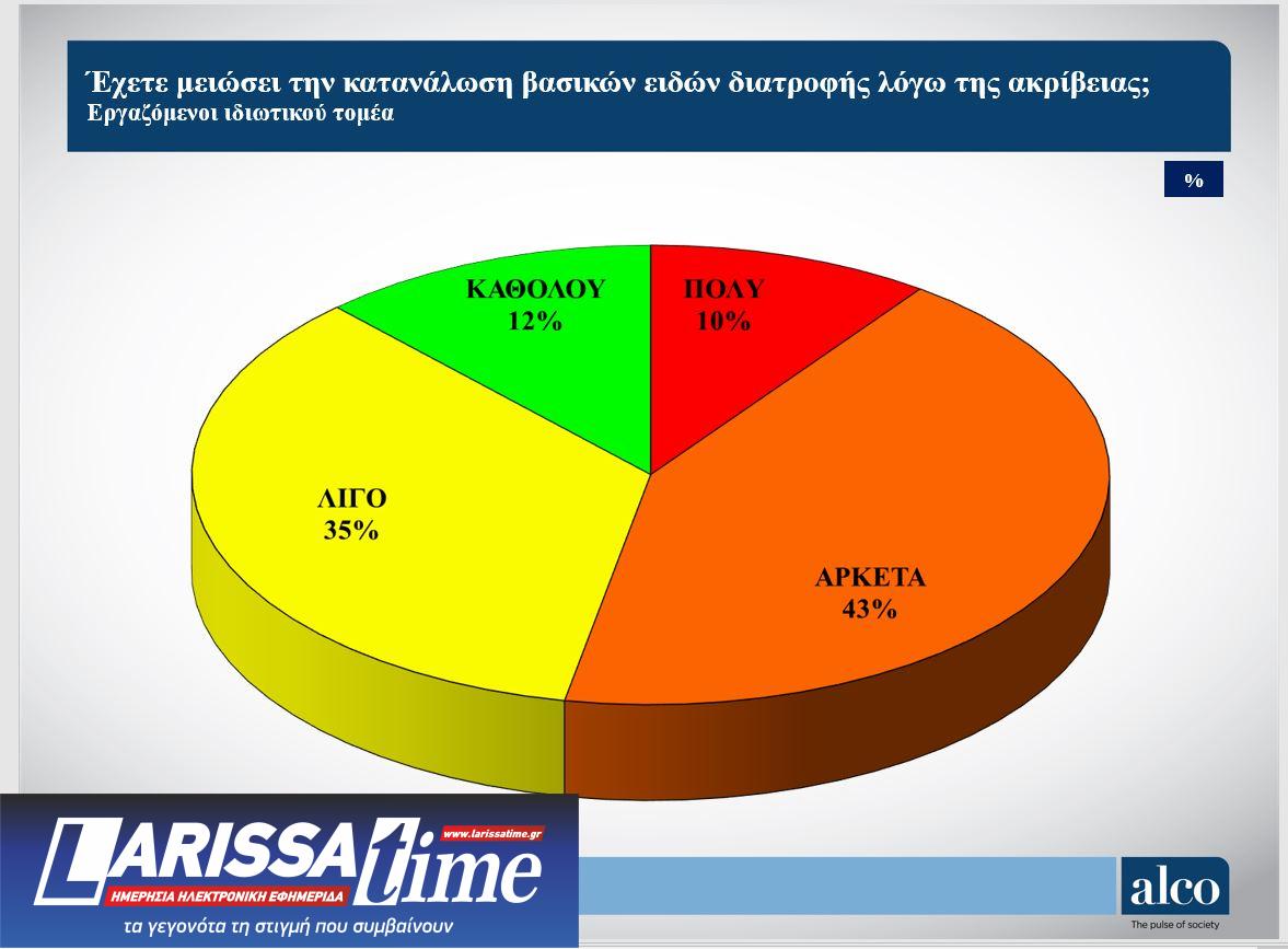 Επίσης η συντριπτική πλειονότητα των μισθωτών έχουν περιορίσει μέχρι και την κατανάλωση βασικών ειδών διατροφής λόγω της ακρίβειας Πάνω από τους μισούς (53%) έχουν μειώσει αρκετά ως πολύ την κατανάλωση βασικών τροφίμων, το 35% την έχει μειώσει λίγο, και μόλις ένα 12% έχει μείνει ανέγγιχτο από την ακρίβεια στα τρόφιμα.