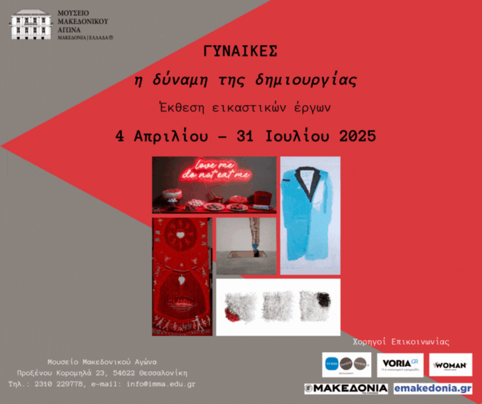 Το Ίδρυμα Μουσείου Μακεδονικού Αγώνα και της Νεότερης Ιστορίας της Μακεδονίας (ΙΜΜΑ) έχει την τιμή να φιλοξενήσει την πολυσυλλεκτική έκθεση εικαστικών έργων πέντε σύγχρονων γυναικών καλλιτεχνών με τίτλο: «ΓΥΝΑΙΚΕΣ, η δύναμη της δημιουργίας», και σας προσκαλεί στα εγκαίνια της έκθεσης που θα πραγματοποιηθούν την Παρασκευή 4 Απριλίου 2025 και ώρα 18:00, στην Αίθουσα Αλέξανδρος Χαΐτογλου στο Μουσείο Μακεδονικού Αγώνα.