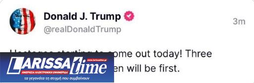 Την επικείμενη απελευθέρωση των τριών Ισραηλινών ομήρων από τη Χαμάς σχολίασε με ανάρτησή του στην πλατφόρμα Truth Social την Κυριακή (19/1) ο Ντόναλντ Τραμπ.
