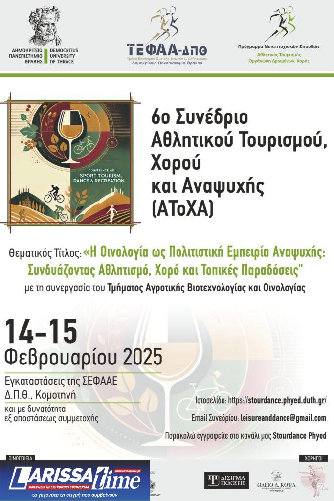 Συνδυάζοντας Αθλητισμό, Χορό και Τοπικές Παραδόσεις, το 6ο Συνέδριο Αθλητικού Τουρισμού, Χορού & Αναψυχής (ΑΤοΧΑ) θα διεξαχθεί στην Κομοτηνή στις 14-15 Φεβρουαρίου 2025, στις εγκαταστάσεις του Τμήματος Επιστήμης Φυσικής Αγωγής & Αθλητισμού (ΤΕΦΑΑ) του Δημοκρίτειου Πανεπιστημίου Θράκης (ΣΕΦΑΑΕ ΔΠΘ), στην πανεπιστημιούπολη Κομοτηνής. Ο θεματικός τίτλος του συνεδρίου είναι «Η Οινολογία ως πολιτιστική εμπειρία αναψυχής – Συνδυάζοντας αθλητισμό, χορό και τοπικές παραδόσεις».