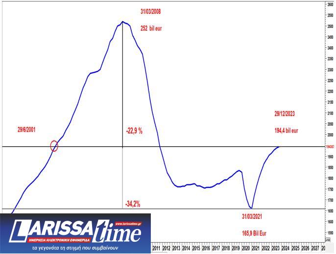 Σε ιστορικό πλαίσιο και πάντα σε πραγματικές τιμές, το ΑΕΠ της χώρας συνεχίζει να είναι χαμηλότερο από το επίπεδο του Μαρτίου του 2001. Σε σχέση δε με το υψηλό επίπεδο των 252 δις του Μαρτίου του 2008, το συνολικό εθνικό προϊόν υπολείπεται ακόμη κατά 22,9%.