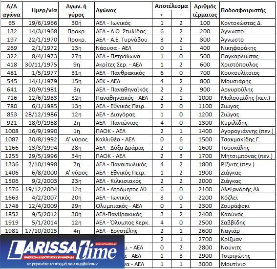 1η Φεβρουαρίου 2025, 18η αγωνιστική, στον υπ’ αριθμό 2314 αγώνα με αντίπαλο τον ΠΑΣ Γιάννινα (1-1) στο εθνικό στάδιο Ιωαννίνων “Οι Ζωσιμάδες”, για το πρωτάθλημα Super League 2, η ΑΕΛ συμπλήρωσε ενεργητικό τριών χιλιάδων (3000) τερμάτων, όπως φαίνεται στη σχετική εικόνα, ταξινομημένα ανά εκατό.