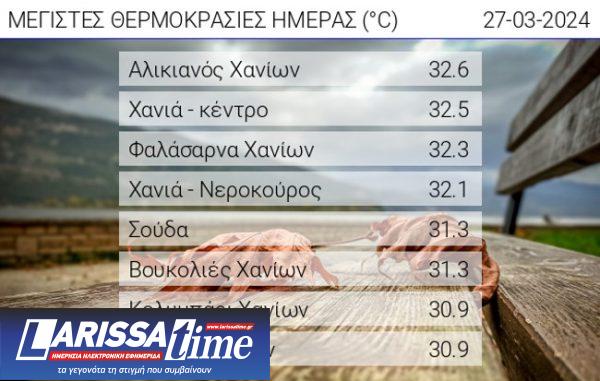 Χθες Τετάρτη, σύμφωνα με τις παρατηρήσεις του δικτύου αυτόματων μετεωρολογικών σταθμών του meteo.gr / Εθνικού Αστεροσκοπείου Αθηνών, η μέγιστη θερμοκρασία έφτασε στους 32.6 βαθμούς Κελσίου σε περιοχές της Βόρειας Κρήτης.