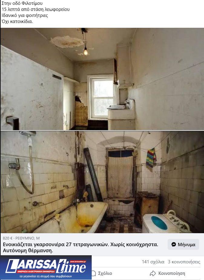 Η υποτιθέμενη αγγελία περιέγραφε το ακίνητο ως «ιδανικό για φοιτήτριες», ενώ στις φωτογραφίες φαινόταν ένας χώρος σχεδόν ακατοίκητος, με εμφανείς φθορές και άθλιες συνθήκες. Παρ’ όλα αυτά, η τιμή παρέμενε εξωφρενικά υψηλή, όπως ακριβώς συμβαίνει και στην πραγματική αγορά.