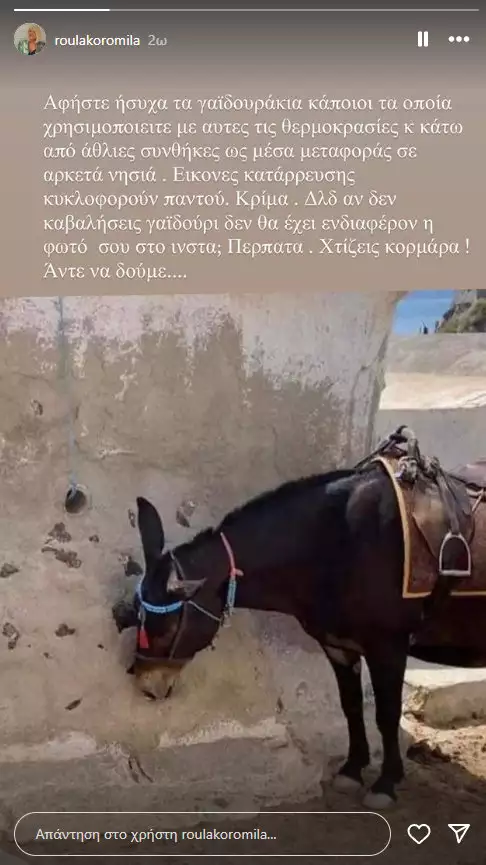 Μέσα από τον προσωπικό της λογαριασμό στο Instagram, η Ρούλα Κορομηλά εκφράζει την έντονη αγανάκτησή της κατά όσων εκμεταλλεύονται τα ζώα για τη μεταφορά τους, με αφορμή τις εικόνες που παρατηρούμε κάθε καλοκαίρι στα ελληνικά νησιά.