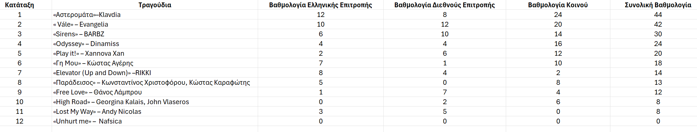 Η αναλυτική βαθμολογία των 12 τραγουδιών του Εθνικού Τελικού είναι η εξής: