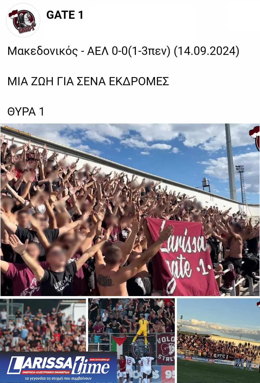 Με αφορμή την εκτός έδρας αναμέτρηση του Κυπέλλου Ελλάδας της ΑΕΛ με το Μακεδονικό, που έγινε το Σάββατο (14/09) στο Γήπεδο Μακεδονικού οι οργανωμένοι οπαδοί των «βυσσινί» Θύρα 1 μέσα από τα social media έκαναν την παρακάτω ανάρτηση μαζί με φωτογραφίες.